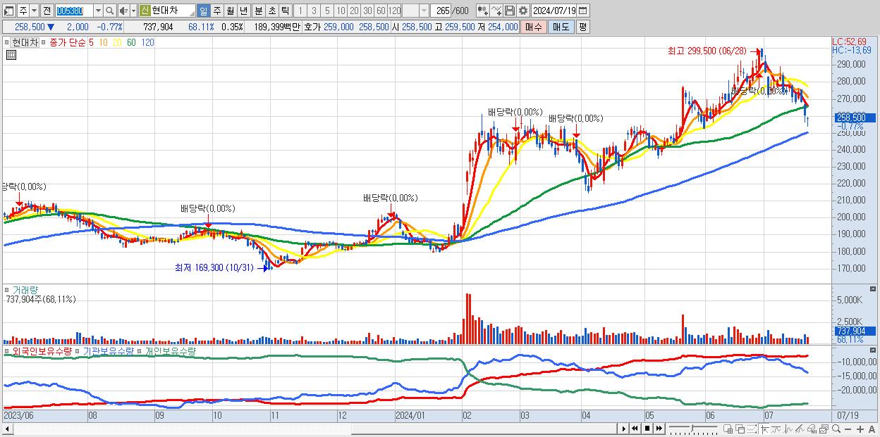 - 현대차 (258,500원 ▼ -0.77% , 시총: 541,341억, 거래량: 737,904, 거래대금:1,894억)
