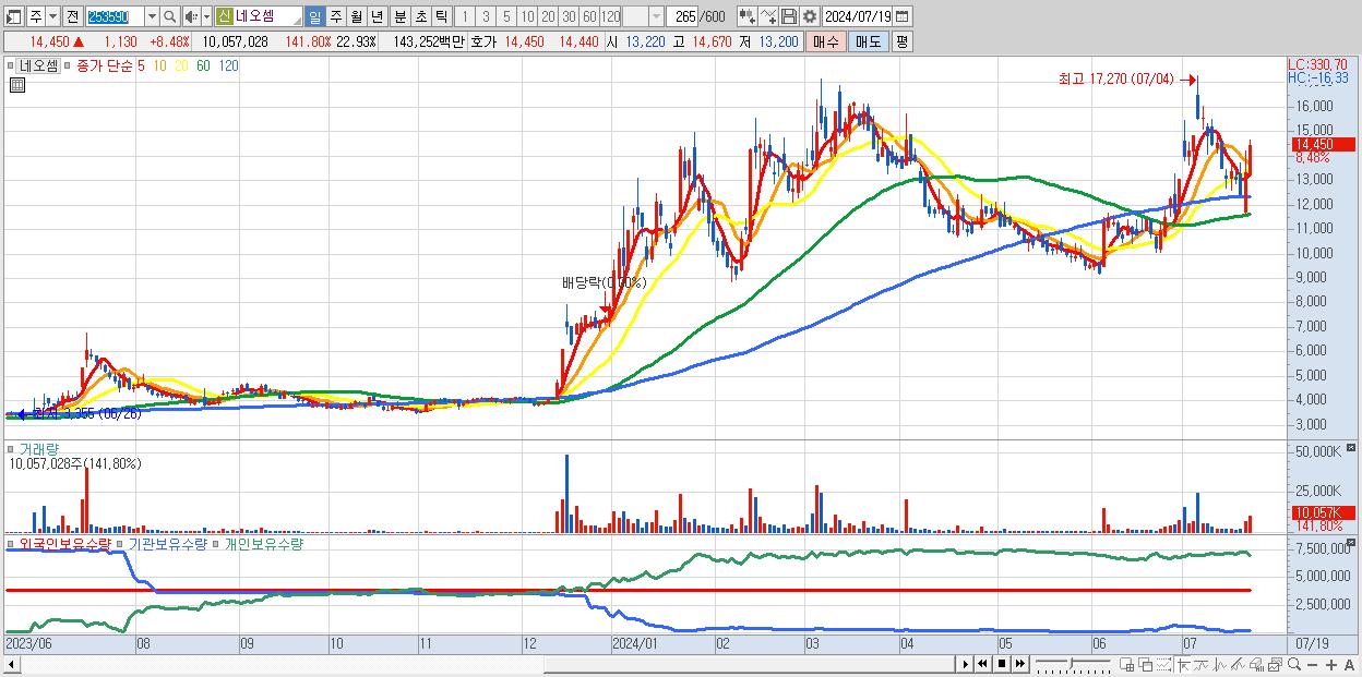 - 네오셈 (14,450원 ▲ 8.48% , 시총: 6,339억, 거래량: 10,057,028, 거래대금:1,433억)