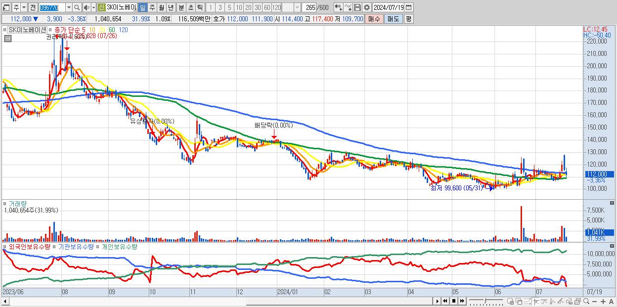 - SK이노베이션 (112,000원 ▼ -3.36% , 시총: 107,224억, 거래량: 1,040,654, 거래대금:1,165억)