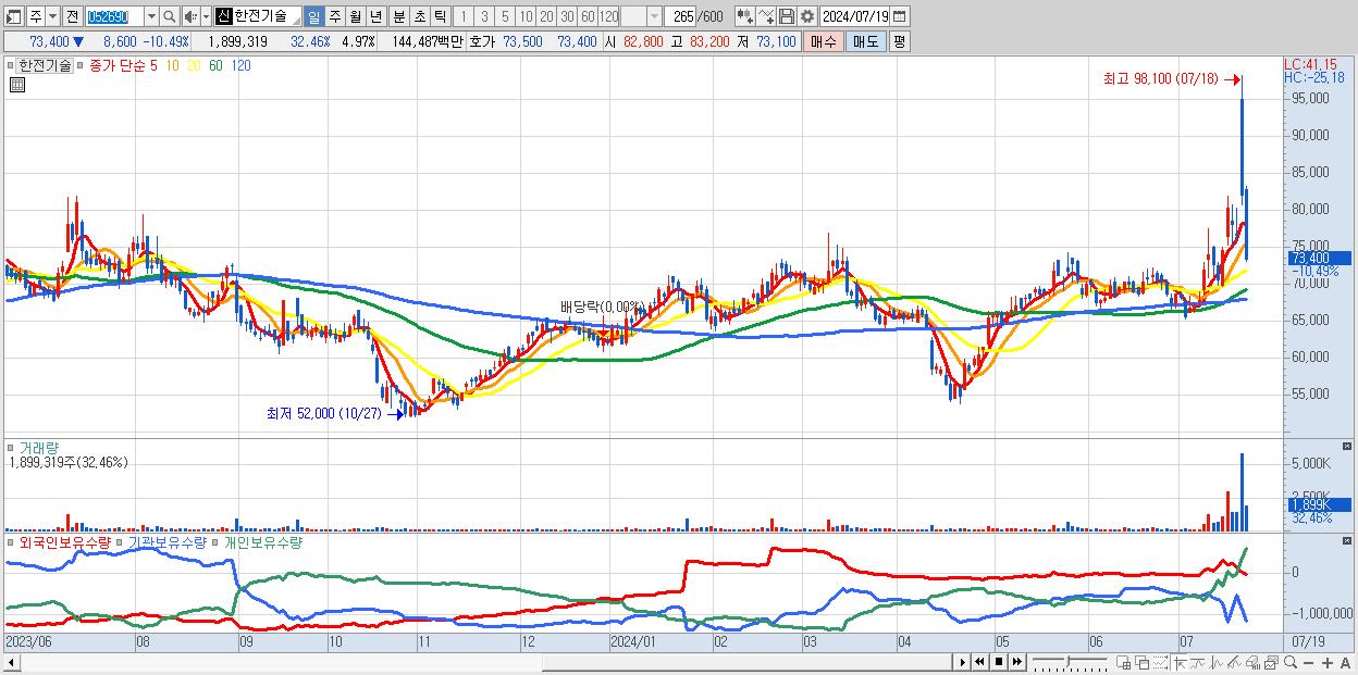 - 한전기술 (73,400원 ▼ -10.49% , 시총: 28,053억, 거래량: 1,899,319, 거래대금:1,445억)
