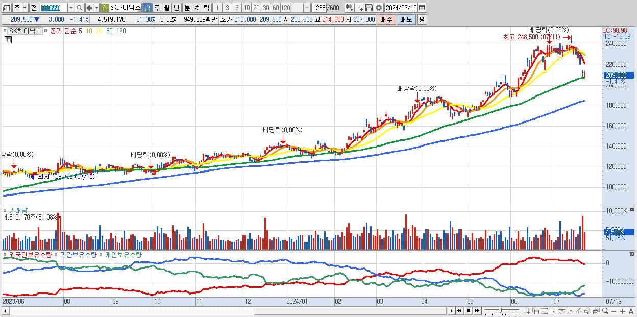 - SK하이닉스 (209,500원 ▼ -1.41% , 시총: 1,525,165억, 거래량: 4,519,170, 거래대금:9,490억)