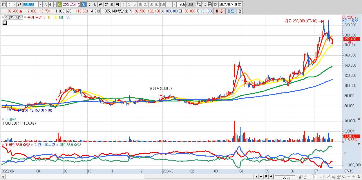 - 삼천당제약 (192,400원 ▲ 3.78% , 시총: 45,132억, 거래량: 1,080,628, 거래대금:2,054억)