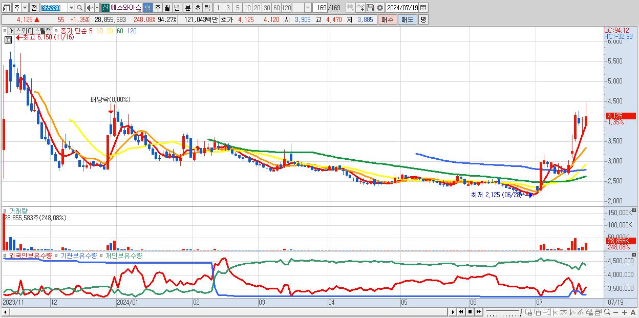 - 에스와이스틸텍 (4,125원 ▲ 1.35% , 시총: 1,263억, 거래량: 28,855,583, 거래대금:1,210억)
