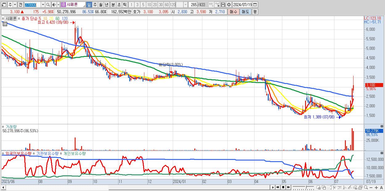 - 샤페론 (3,100원 ▲ 5.98% , 시총: 934억, 거래량: 50,278,996, 거래대금:1,626억)