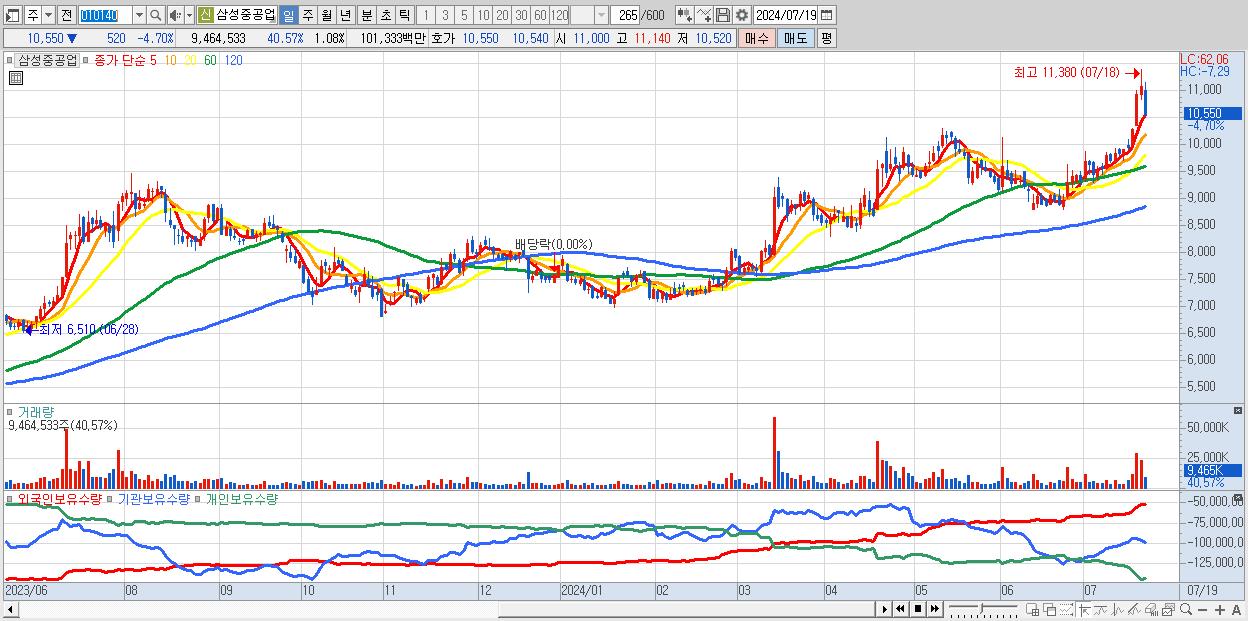 - 삼성중공업 (10,550원 ▼ -4.7% , 시총: 92,840억, 거래량: 9,464,533, 거래대금:1,013억)