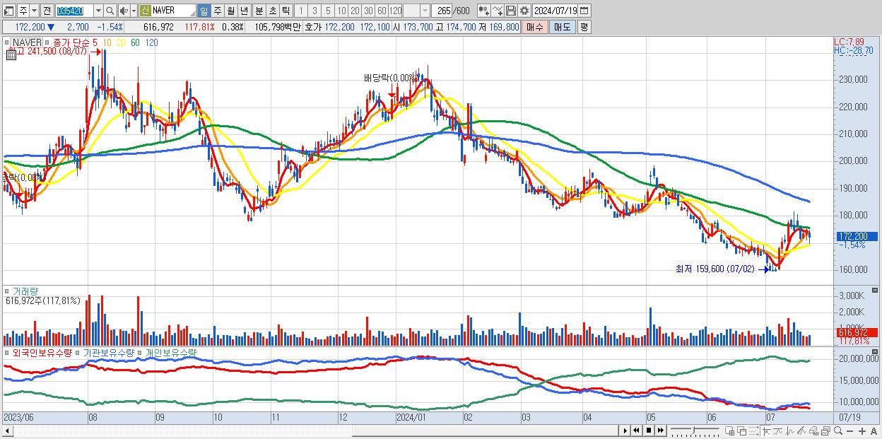- NAVER (172,200원 ▼ -1.54% , 시총: 279,668억, 거래량: 616,972, 거래대금:1,058억)