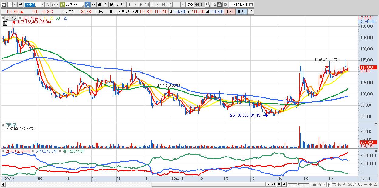 - LG전자 (111,800원 ▲ 0.81% , 시총: 182,958억, 거래량: 907,720, 거래대금:1,019억)