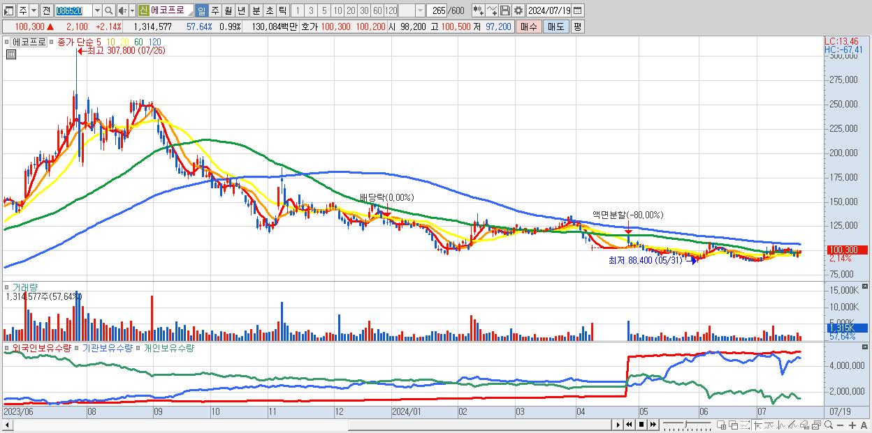 - 에코프로 (100,300원 ▲ 2.14% , 시총: 133,538억, 거래량: 1,314,577, 거래대금:1,301억)