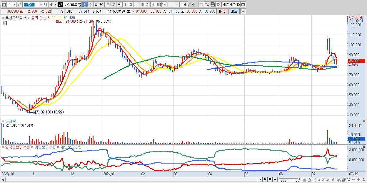 - 두산로보틱스 (83,900원 ▲ 2.69% , 시총: 54,384억, 거래량: 1,721,816, 거래대금:1,446억)