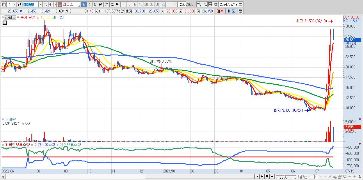 - 라파스 (26,650원 ▼ -8.42% , 시총: 2,310억, 거래량: 3,694,912, 거래대금:1,077억)