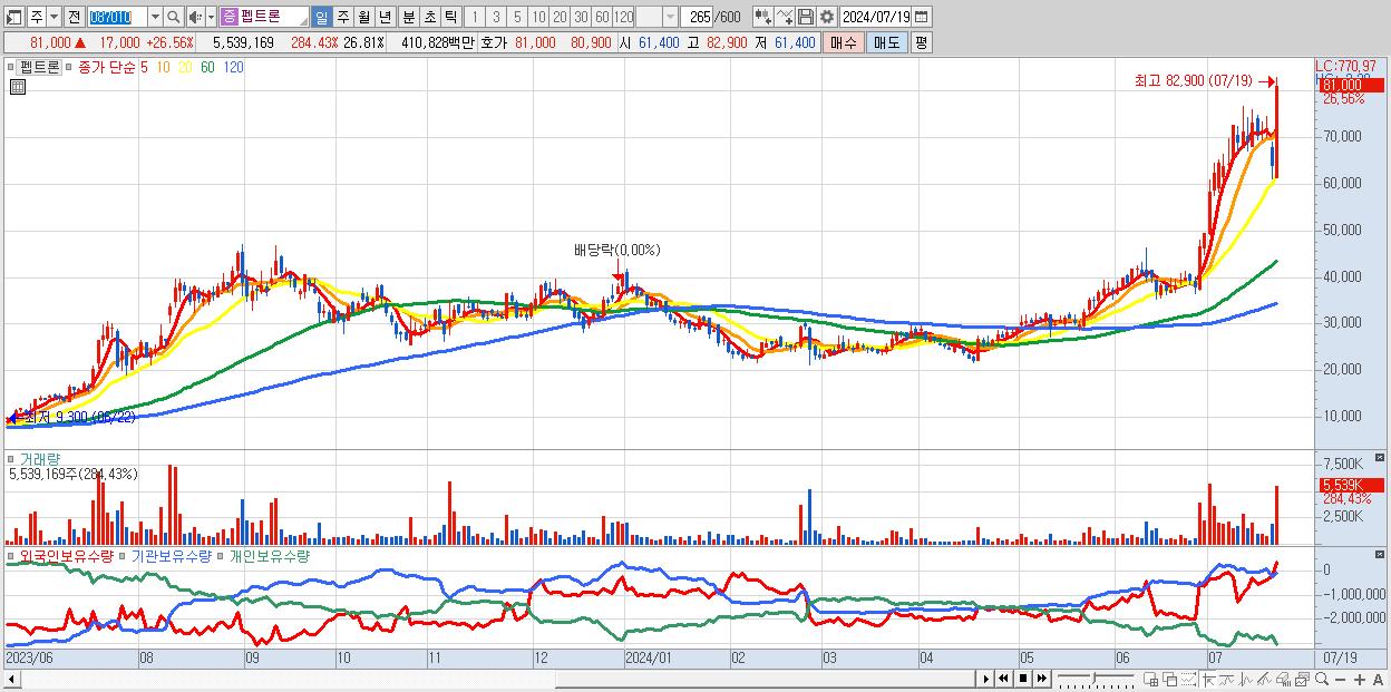 - 펩트론 (81,000원 ▲ 26.56% , 시총: 16,732억, 거래량: 5,539,169, 거래대금:4,108억)