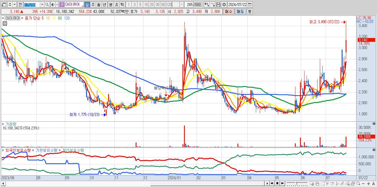 - 아이큐어 (3,140원 ▲ 14.39% , 시총: 1,179억, 거래량: 16,180,342, 거래대금:520억)