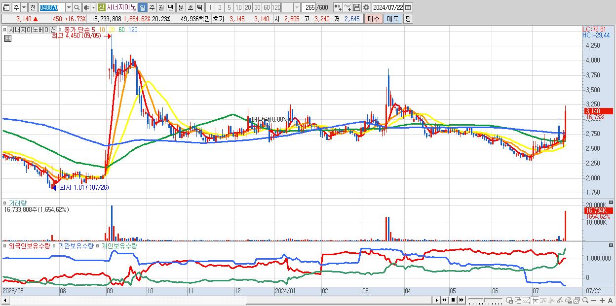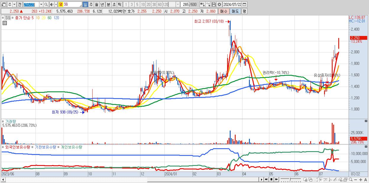 - SG (2,250원 ▲ 13.24% , 시총: 2,051억, 거래량: 5,575,463, 거래대금:120억)