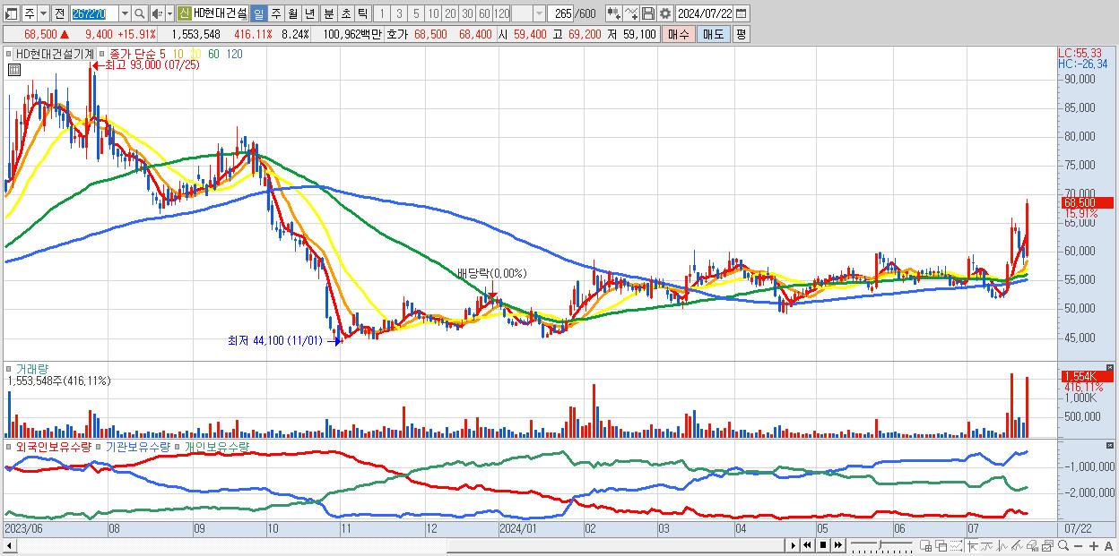 - HD현대건설기계 (68,500원 ▲ 15.91% , 시총: 12,910억, 거래량: 1,553,548, 거래대금:1,010억)