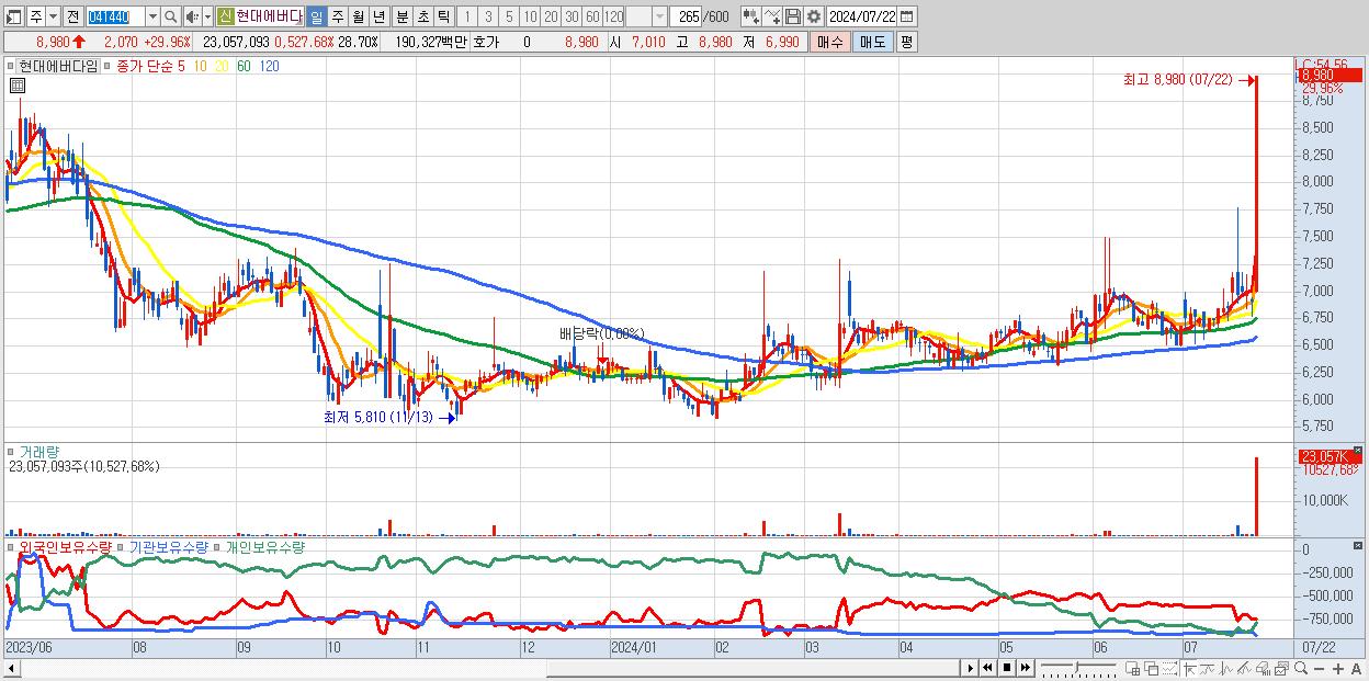 2.현대에버다임 8,980원 ▲ 29.96% (KOSDAQ, 041440)