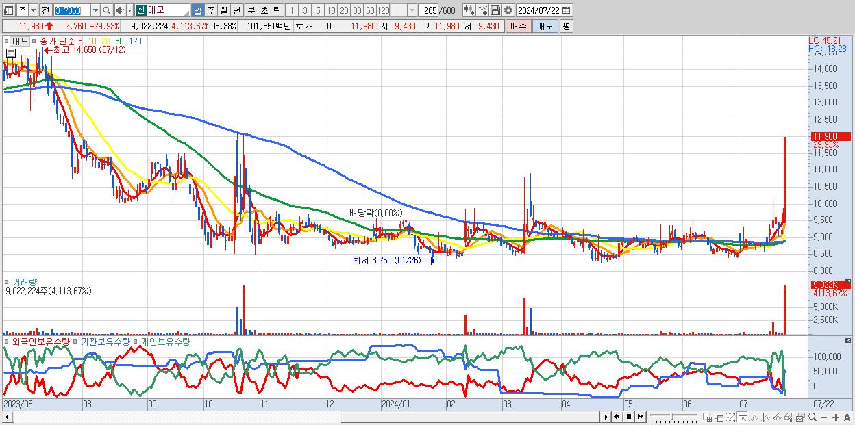 - 대모 (11,980원 ▲ 29.93% , 시총: 997억, 거래량: 9,022,224, 거래대금:1,017억)