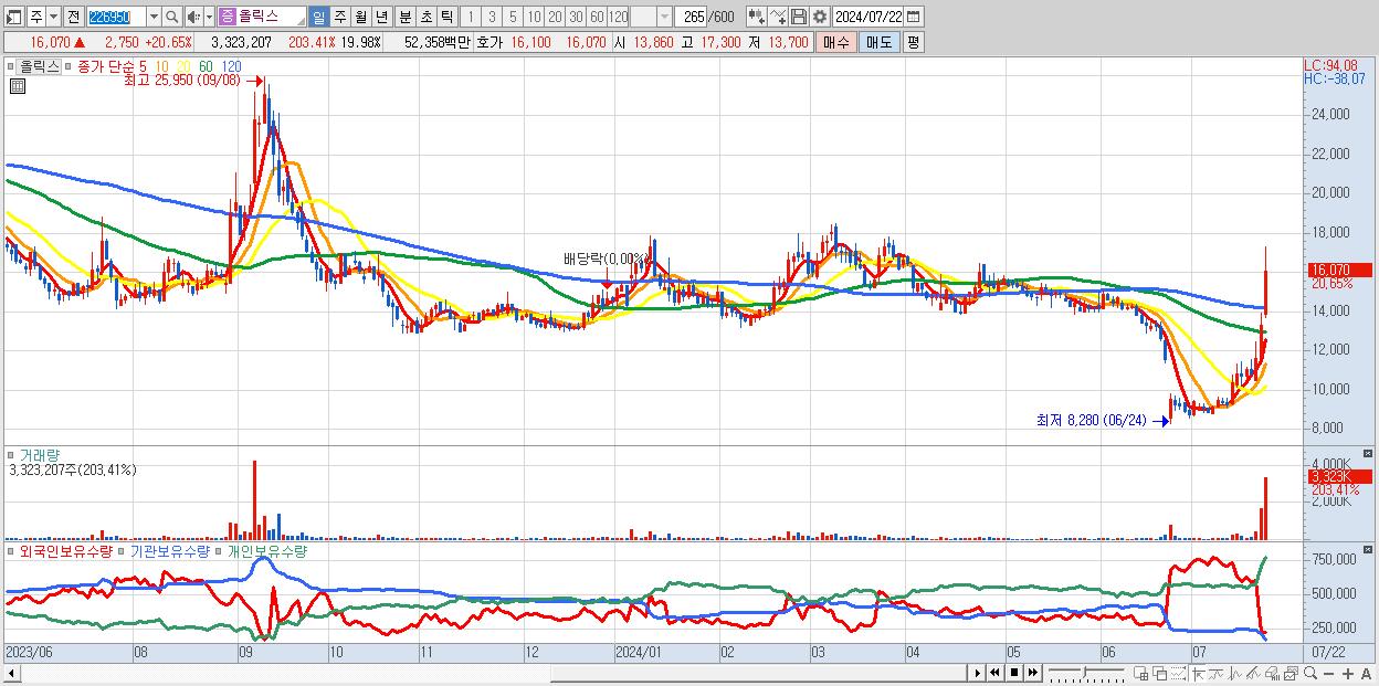 - 올릭스 (16,070원 ▲ 20.65% , 시총: 2,673억, 거래량: 3,323,207, 거래대금:524억)
