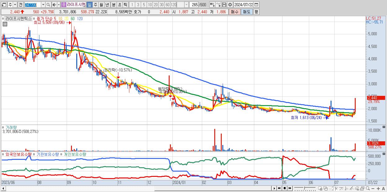 - 라이프시맨틱스 (2,440원 ▲ 29.79% , 시총: 407억, 거래량: 3,701,806, 거래대금:86억)