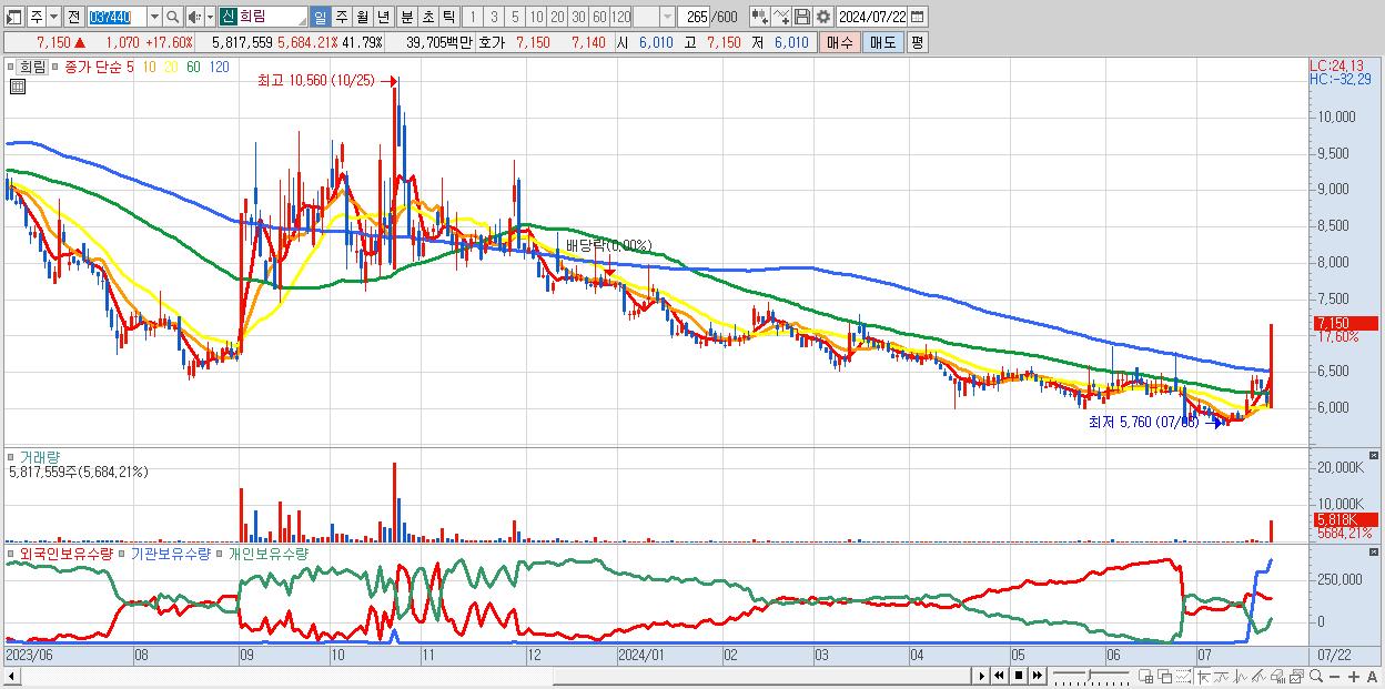 - 희림 (7,150원 ▲ 17.6% , 시총: 995억, 거래량: 5,817,559, 거래대금:397억)