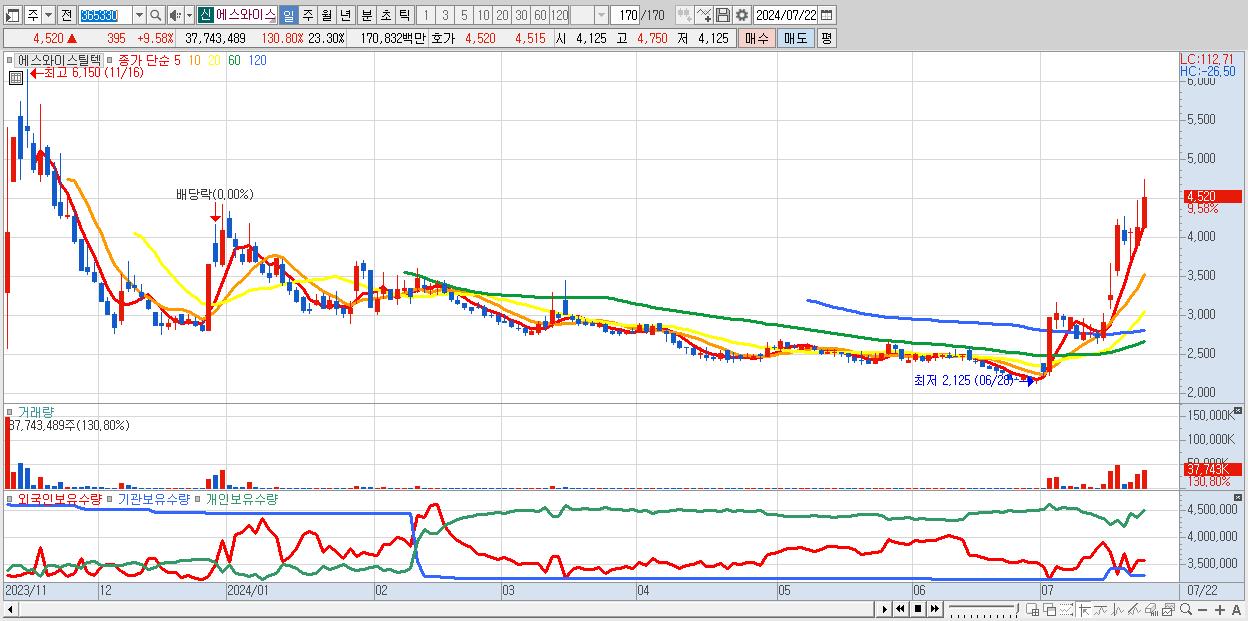 - 에스와이스틸텍 (4,520원 ▲ 9.58% , 시총: 1,384억, 거래량: 37,743,489, 거래대금:1,708억)