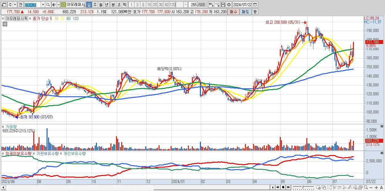 - 아모레퍼시픽 (177,700원 ▲ 8.88% , 시총: 103,942억, 거래량: 693,229, 거래대금:1,211억)