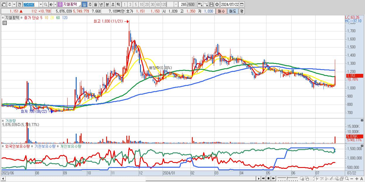 - 지엘팜텍 (1,151원 ▲ 10.78% , 시총: 883억, 거래량: 5,876,039, 거래대금:71억)