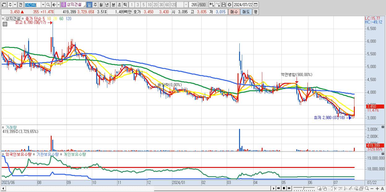 - 상지건설 (3,450원 ▲ 11.47% , 시총: 412억, 거래량: 419,399, 거래대금:15억)