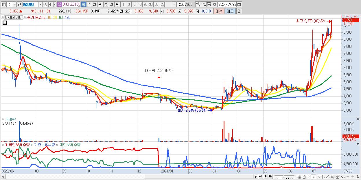- 아이오케이 (9,350원 ▲ 11.18% , 시총: 724억, 거래량: 270,143, 거래대금:24억)