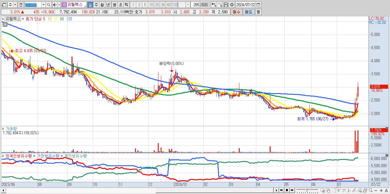 - 유틸렉스 (3,015원 ▲ 16.86% , 시총: 1,109억, 거래량: 7,792,494, 거래대금:231억)