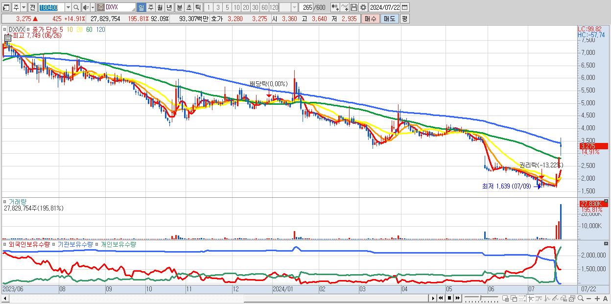 - DXVX (3,275원 ▲ 14.91% , 시총: 990억, 거래량: 27,829,754, 거래대금:933억)