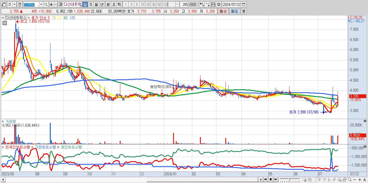 - 다산네트웍스 (3,705원 ▲ 15.06% , 시총: 1,464억, 거래량: 8,952,199, 거래대금:333억)