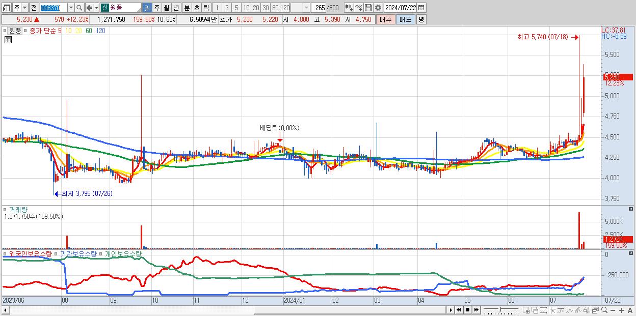 - 원풍 (5,230원 ▲ 12.23% , 시총: 628억, 거래량: 1,271,758, 거래대금:65억)