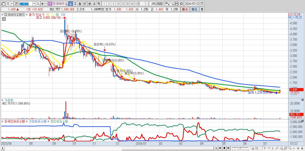 - 미코바이오메드 (1,430원 ▲ 10.42% , 시총: 623억, 거래량: 962,757, 거래대금:13억)