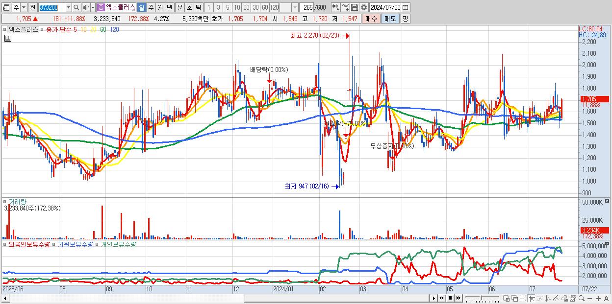 - 엑스플러스 (1,705원 ▲ 11.88% , 시총: 1,291억, 거래량: 3,233,840, 거래대금:53억)