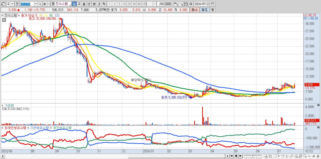 - 진시스템 (9,830원 ▲ 13.77% , 시총: 689억, 거래량: 536,513, 거래대금:52억)