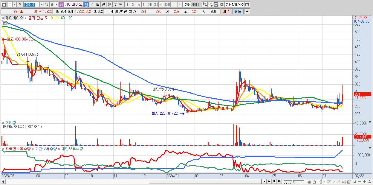 - 케이바이오 (291원 ▲ 11.92% , 시총: 337억, 거래량: 15,964,681, 거래대금:48억)