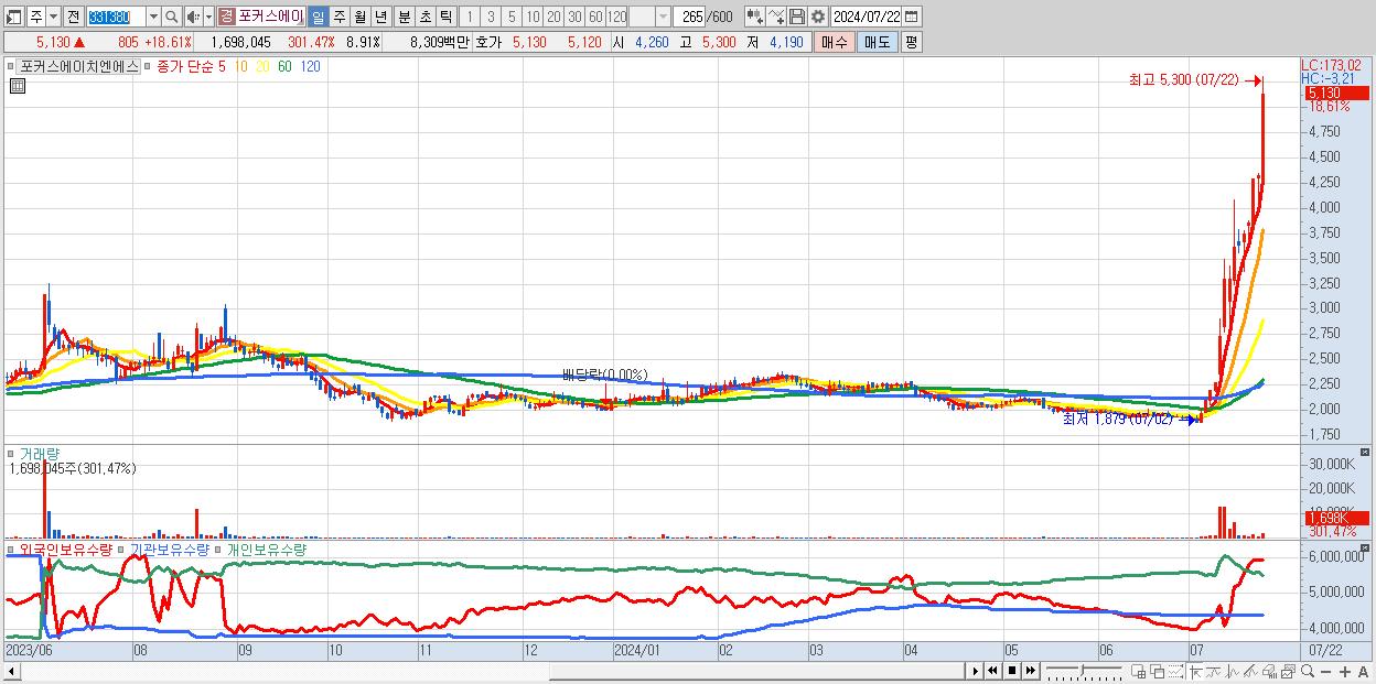 - 포커스에이치엔에스 (5,130원 ▲ 18.61% , 시총: 977억, 거래량: 1,698,045, 거래대금:83억)