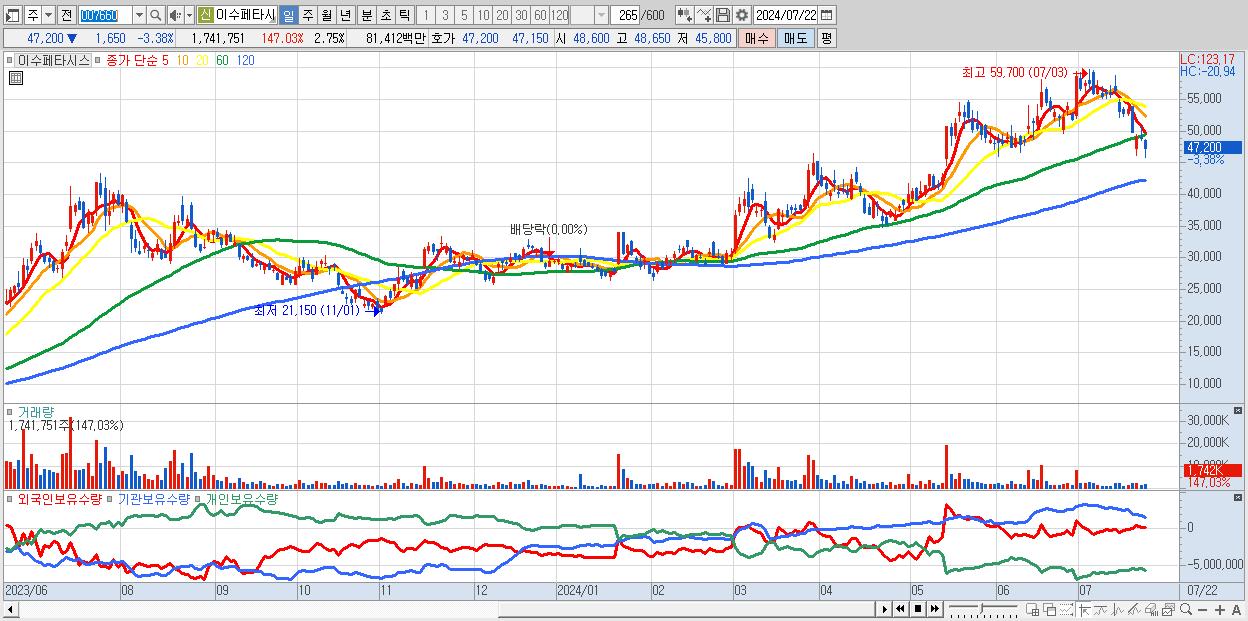 - 이수페타시스 (47,200원 ▼ -3.38% , 시총: 29,852억, 외국인 순매수 거래금:161억)