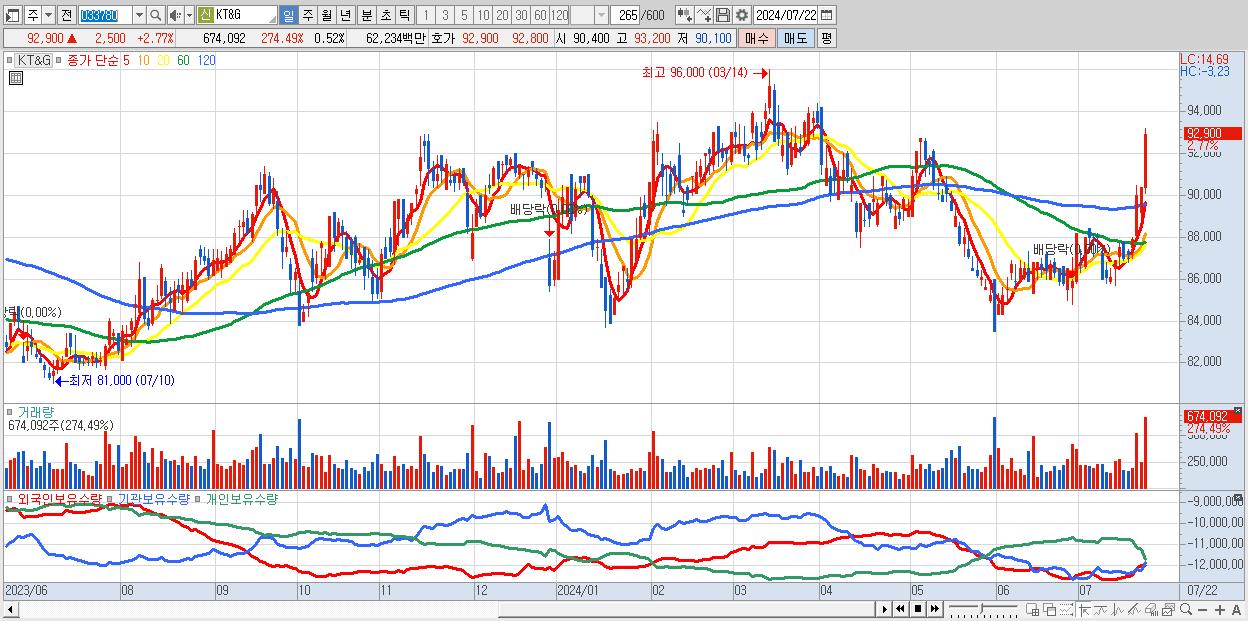 1.KT&G 92,900원 ▲ 2.77% (KOSPI, 033780)