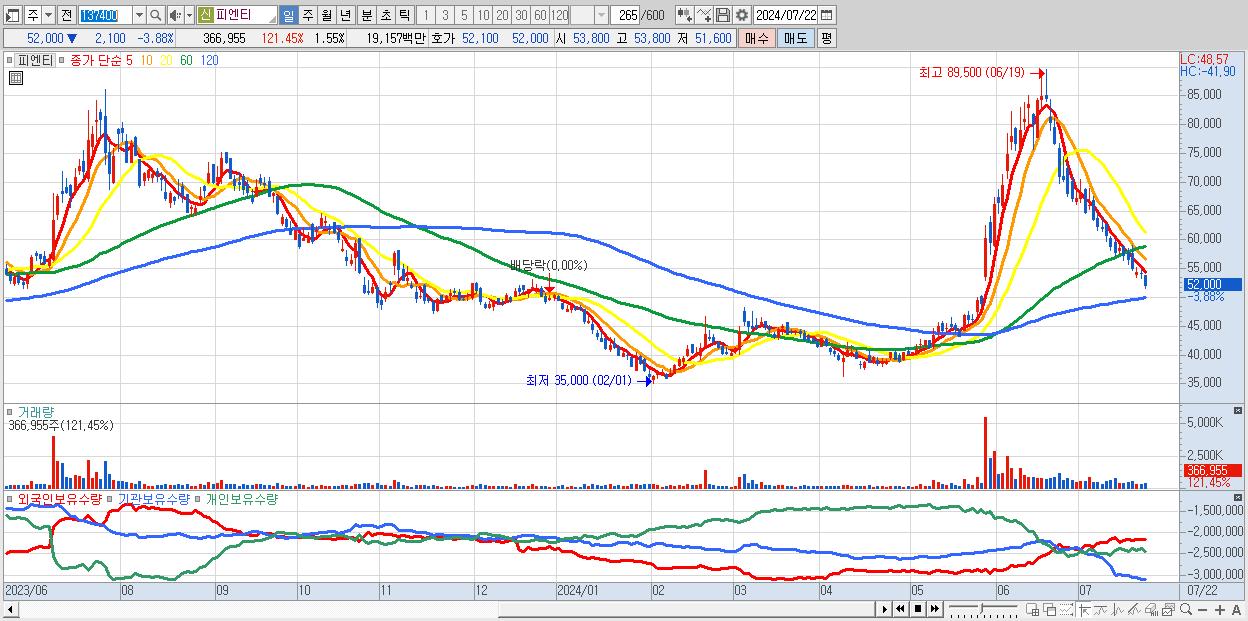 - 피엔티 (52,000원 ▼ -3.88% , 시총: 12,346억, 외국인 순매수 거래금:47억)