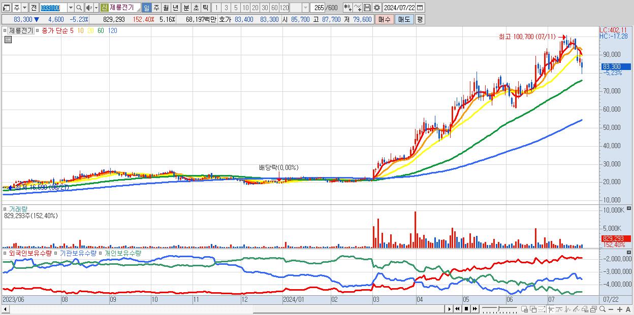 - 제룡전기 (83,300원 ▼ -5.23% , 시총: 13,380억, 외국인 순매수 거래금:58억)