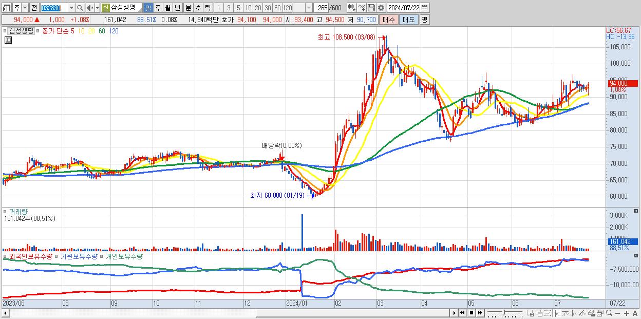 - 삼성생명 (94,000원 ▲ 1.08% , 시총: 188,000억, 외국인 순매수 거래금:38억)