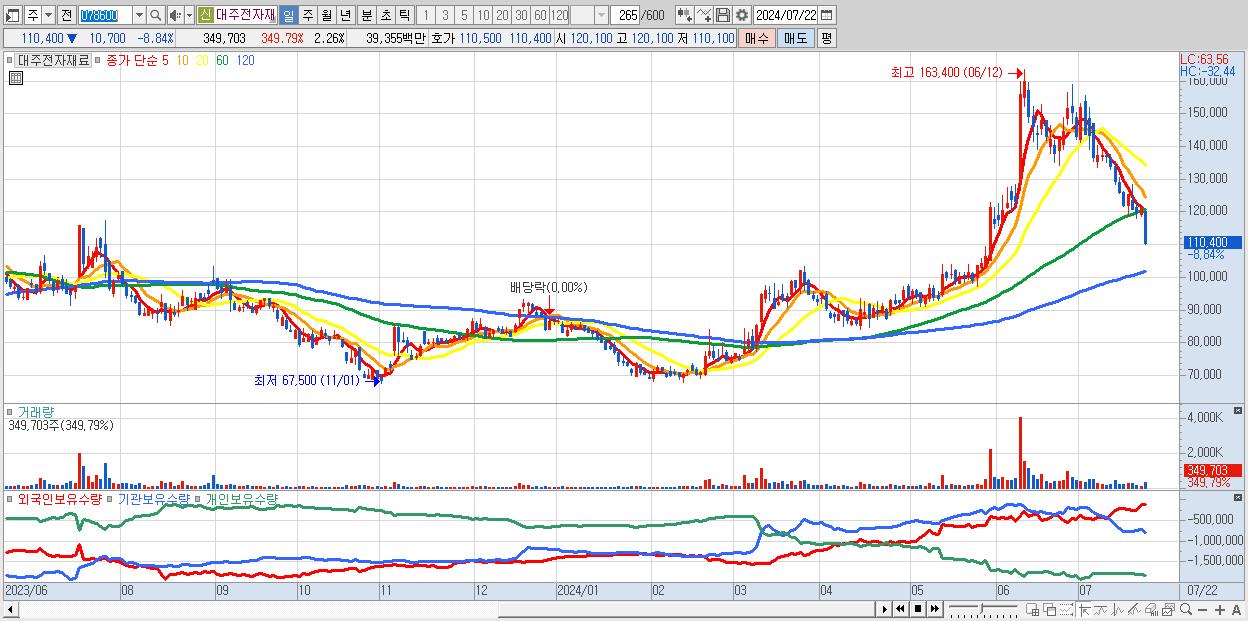 - 대주전자재료 (110,400원 ▼ -8.84% , 시총: 17,091억, 외국인 순매수 거래금:65억)