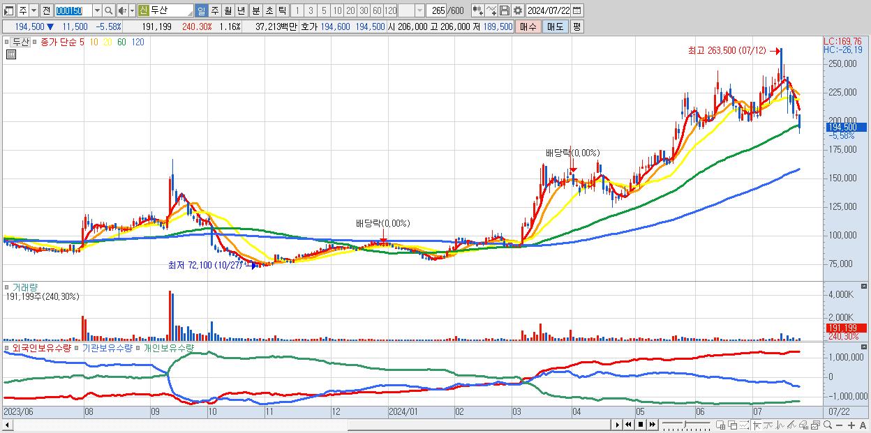 - 두산 (194,500원 ▼ -5.58% , 시총: 32,139억, 외국인 순매수 거래금:64억)