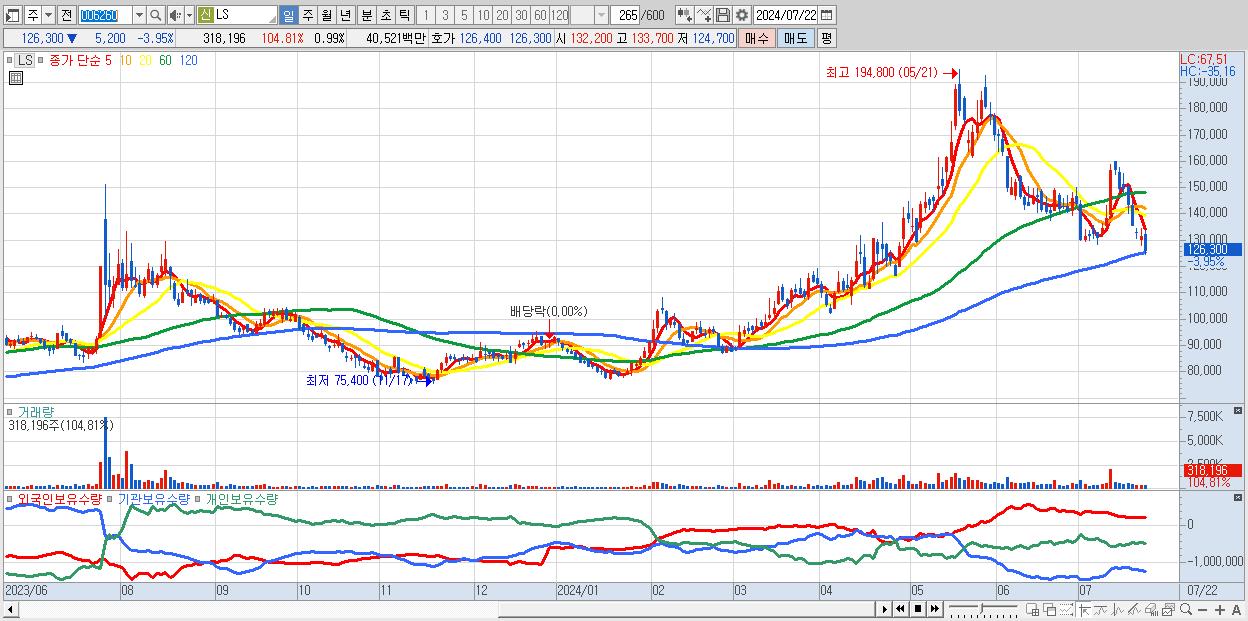 - LS (126,300원 ▼ -3.95% , 시총: 40,669억, 외국인 순매수 거래금:72억)