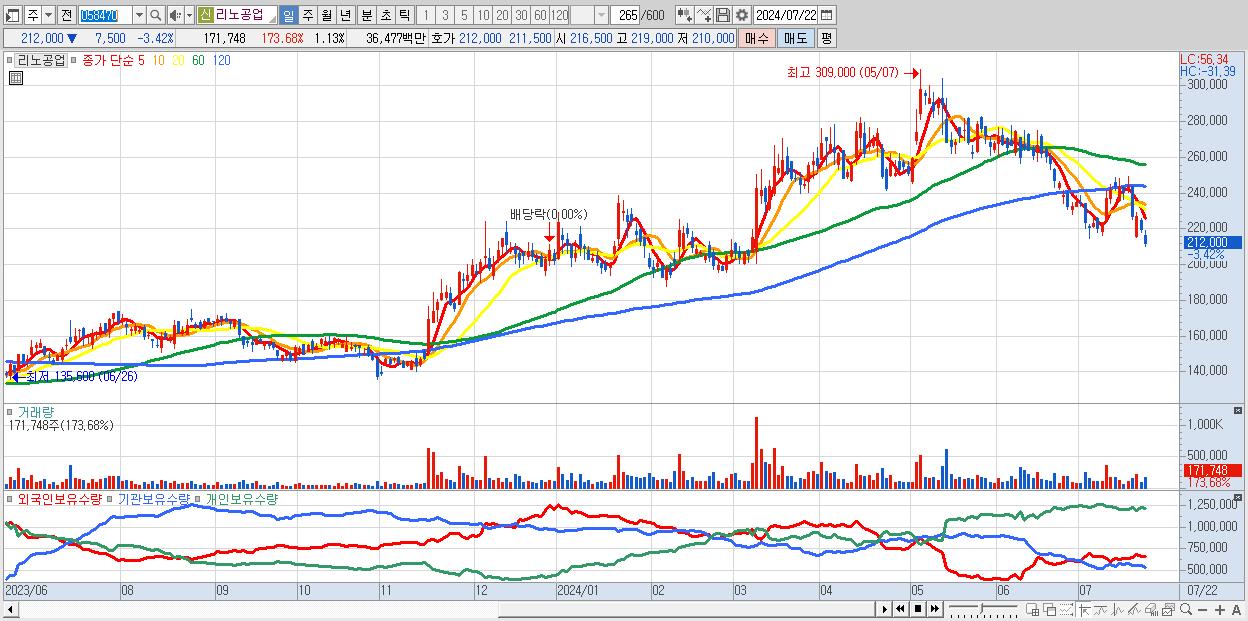 - 리노공업 (212,000원 ▼ -3.42% , 시총: 32,314억, 외국인 순매수 거래금:87억)