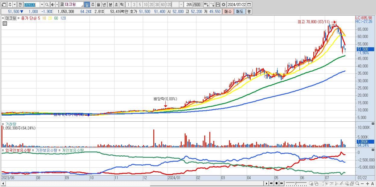 - 테크윙 (51,500원 ▼ -1.9% , 시총: 19,237억, 외국인 순매수 거래금:54억)