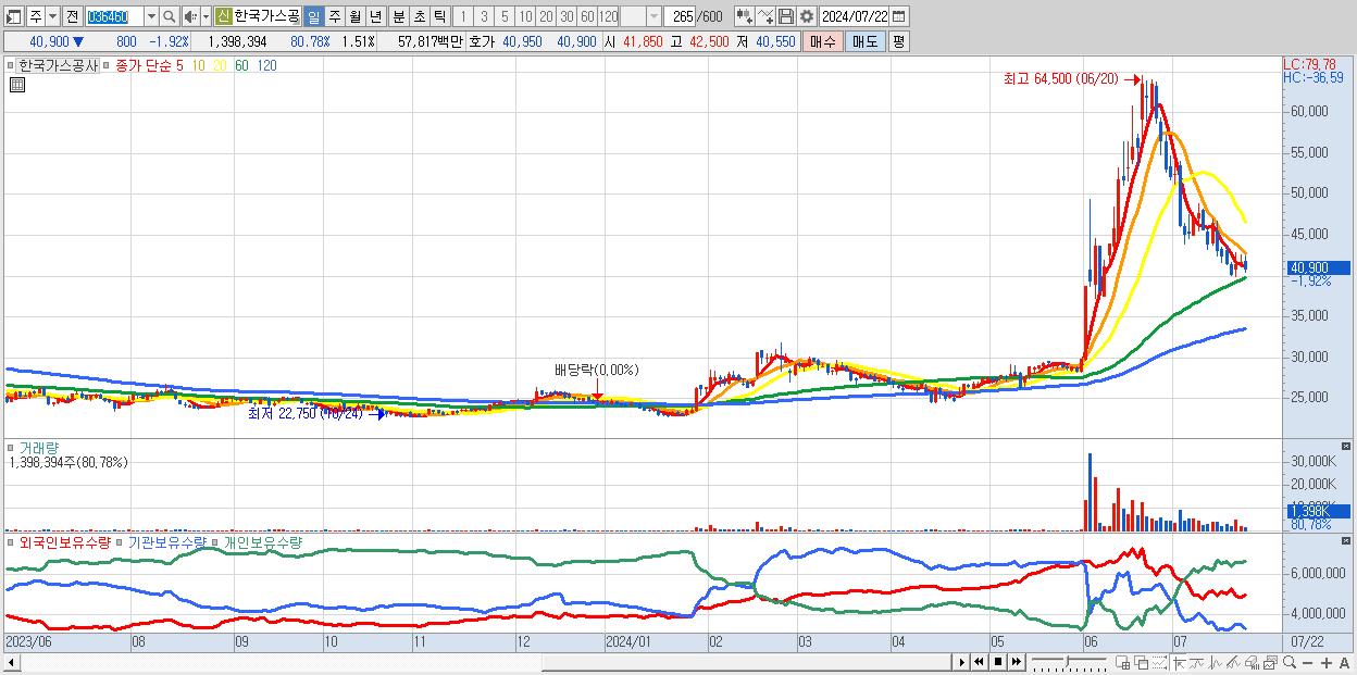 - 한국가스공사 (40,900원 ▼ -1.92% , 시총: 37,756억, 외국인 순매수 거래금:48억)