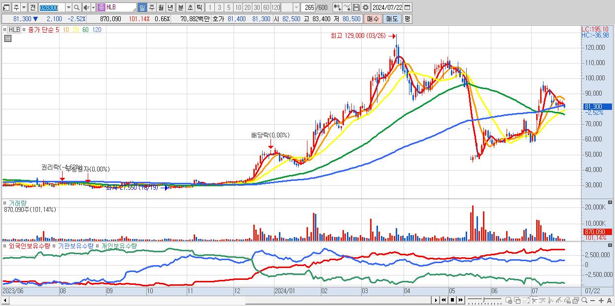 - HLB (81,300원 ▼ -2.52% , 시총: 106,377억, 외국인 순매수 거래금:59억)