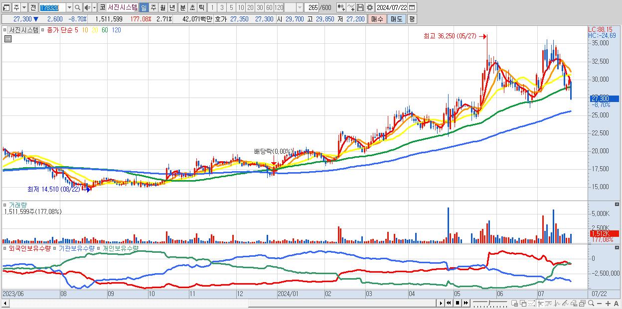 30.서진시스템 27,300원 ▼ -8.7% (KOSDAQ, 178320)